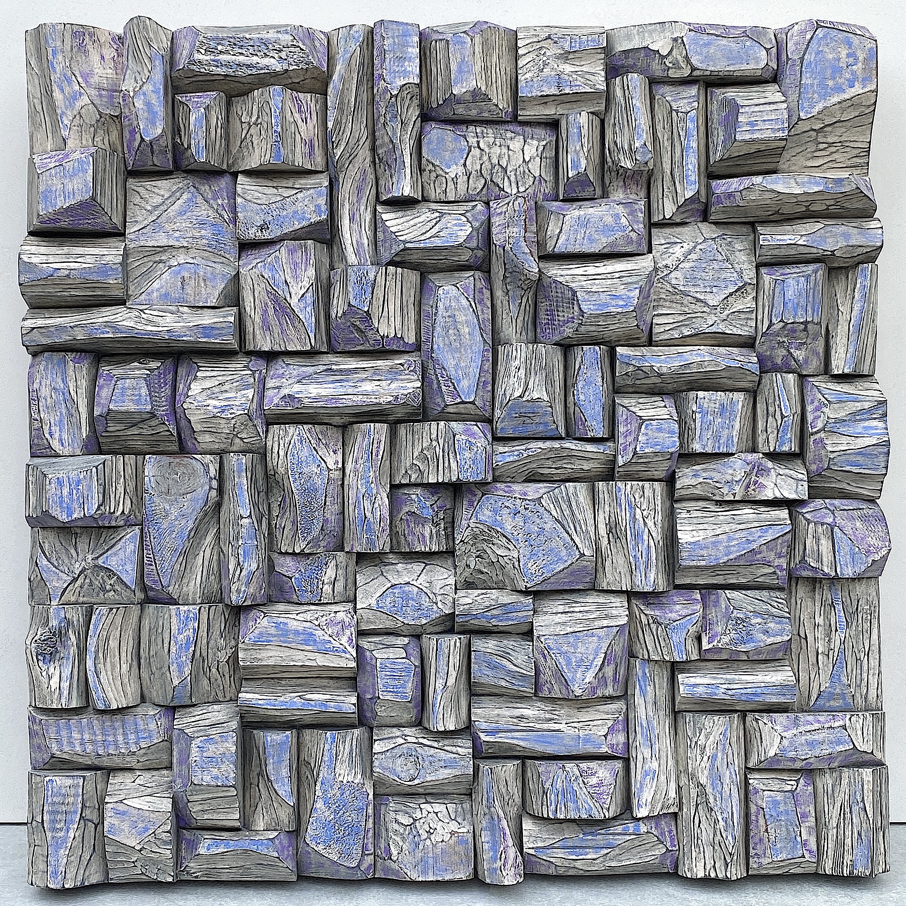carved recycled wood blocks, arranged to create a sense of depth, rhythm, and